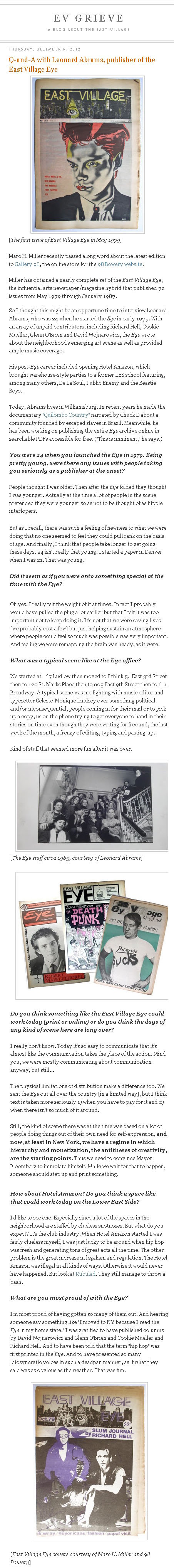 Hyperallergic, the highly followed and amazingly thorough website magazine about "art and its discontents," just published athoughtful and solid piece about the Eye on Wednesday, November 12th, 2014. Author Tiernan Morgan charts the magazine's in-the-trenches coverage of the East Village art scene while not forgetting its precedents, influences and important concurrent movements.